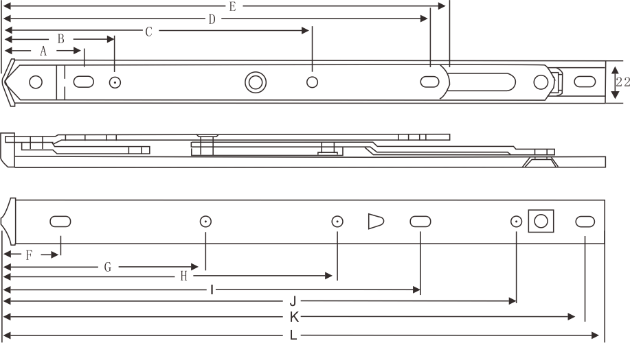 | 連桿數量 | 折片厚度(mm) | 規格\值 | A | B | C | D | E | F | G | H | I | J | K | L | 窗最高(mm) | 窗最寬(mm) | 窗最重(kg) | 開啟角度(±2°) |