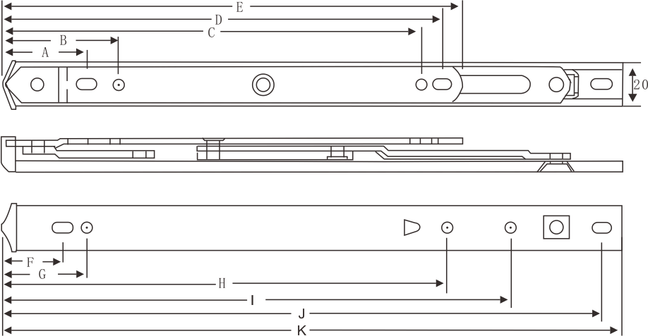 | 連桿數量 | 折片厚度(mm) | 規格\值 | A | B | C | D | E | F | G | H | I | J | K | 窗最高(mm) | 窗最寬(mm) | 窗最重(kg) | 開啟角度(±2°) |
